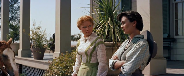 The Big Country both upholds and subverts the status quo when it comes to traditional Western treatment of female characters. The narrative clearly posits that there are both “right” and “wrong” forms of womanhood, as it presents Julie Maragon and Pat Terrill as diametrically opposed both in personality and in worth. Pat is the stereotypically incorrect kind of woman: she is demanding, spoiled, petulant, and – perhaps most importantly – unwilling to submit to the “better judgment” of her love interest, Jim McKay (the film’s hero). She consistently balks against his ideals of true manhood by counterposing her own, summed up in the question she presents to Julie after Jim disappoints her: “If he loved me, why would he let me think he’s a coward?” Julie, by contrast, demonstrates by her response to the question that she is what the narrative considers the correct kind of woman: “If you love him, why would you think it? How many times does a man have to win you?” Julie is everything that Pat (ostensibly) is not: wise, diplomatic, kind, and – perhaps most importantly – aligned with the values of the male hero.